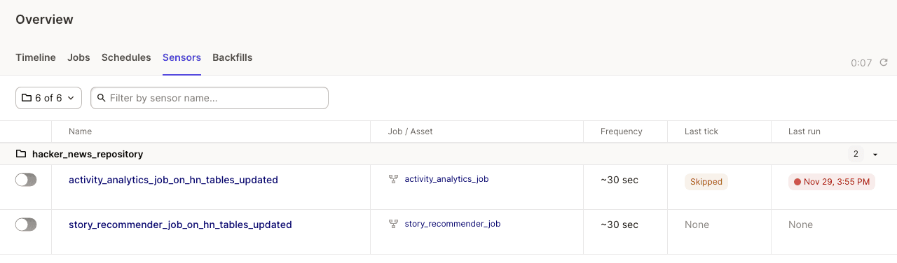 To view all sensors, navigate to Overview > Sensors. Here, you can start and stop sensors, and view their frequency, last tick, and last run:
