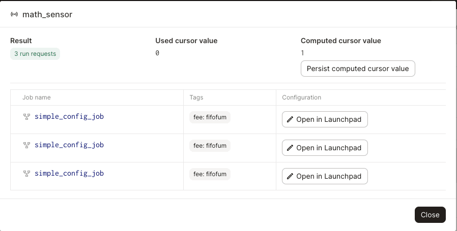 If the run was successful, then for each produced run request, you can open the launchpad pre-scaffolded with the config produced by that run request. You'll also see a new computed cursor value from the evaluation, with the option to persist the value.